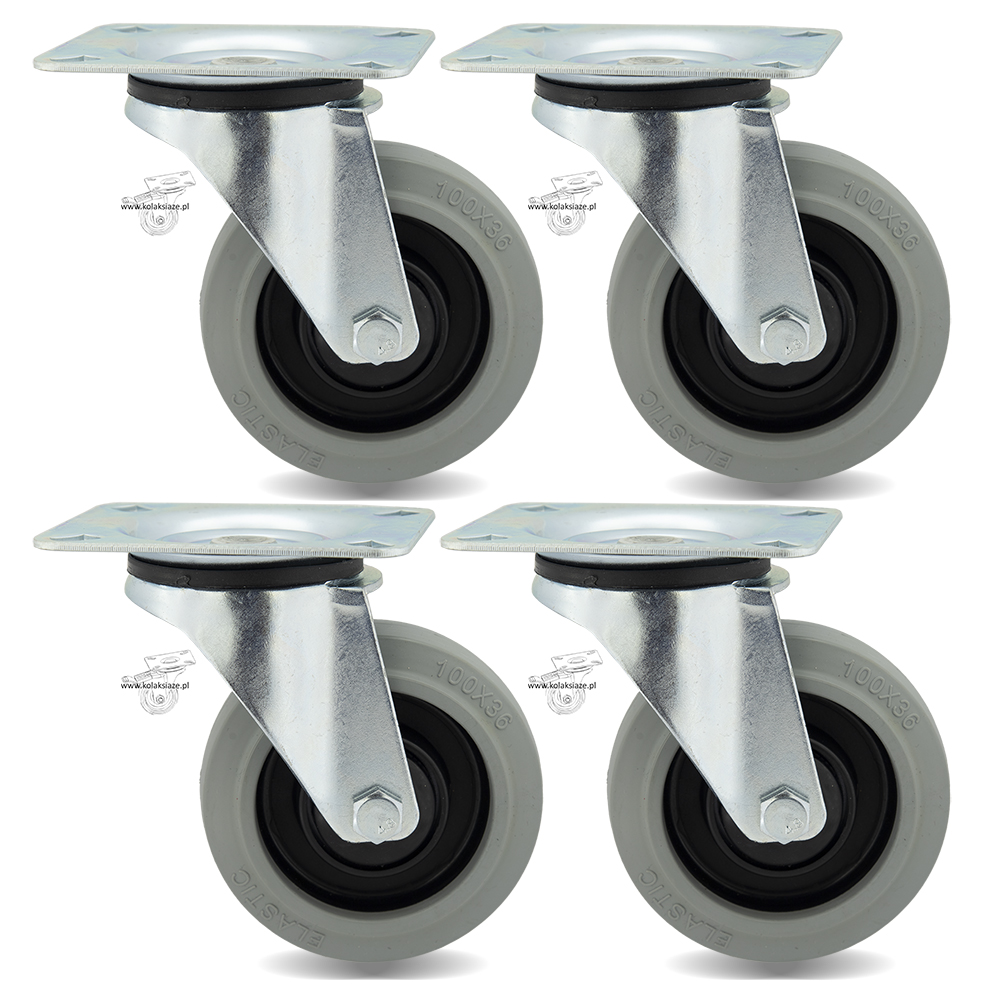 Zestaw składa się z czterech kółek wyposażonych w mocowanie na płytkę, można je zastosować np. jako koła do wózka, gumowe. Mając to na uwadze w komplecie są cztery zestawy o kodzie 1HPOGUS100K1 (poz. 4 w tabeli). Zastosowane koła posiadają piastę poliamidową oraz oponę gumową, obudowa pokryta jest ocynkiem. W koło posiada łożysko kulkowe. Jeśli chodzi o wagę to wynosi 2,784 kg.