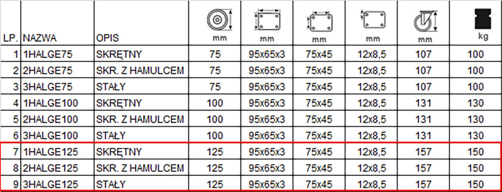 Komplet składa się z czterech kółek wyposażonych w mocowanie na płytkę. W skład kompletu wchodzą dwa koła o kodzie 3HALGE125K2 + podstawka, w tabeli pod pozycją 9, jeden zestaw kołowy skrętny o kodzie 1HALGE125K2+ podstawka w tabeli pod pozycją 7 oraz jeden zestaw kołowy skrętny z hamulcem o kodzie 2HALGE125K2+ podstawka w tabeli pod pozycją 8. Koło posiada piastę z aluminium oraz oponę z gumy, obudowa pokryta jest ocynkiem. W kole podwójne łożysko kulkowe, waga zestawu 6,57 kg.