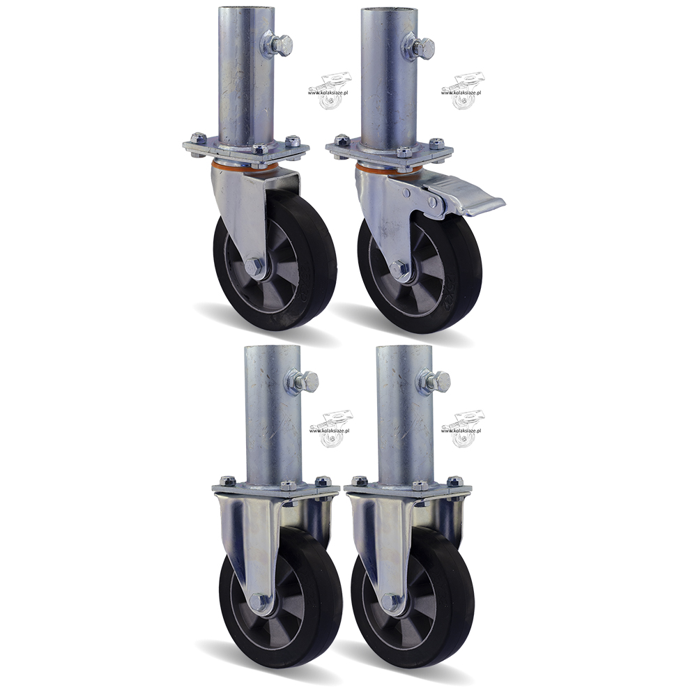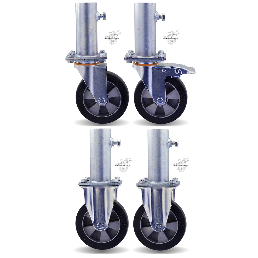 W skład kompletu wchodzą cztery zestawy kołowe, koła gumowe, które wyposażone są w mocowanie na płytkę. W skład kompletu wchodzą dwa zestawy kołowe, koła gumowe o kodzie 3HALGE125K2 + podstawka, w tabeli pod pozycją 9, jeden zestaw kołowy skrętny o kodzie 1HALGE125K2+ podstawka w tabeli pod pozycją 7 oraz jeden zestaw kołowy skrętny z hamulcem o kodzie 2HALGE125K2+ podstawka w tabeli pod pozycją 8. Koło posiada piastę z aluminium oraz oponę z gumy, obudowa pokryta jest ocynkiem. W kole podwójne łożysko kulkowe, waga zestawu 6,57 kg. Wewnętrzna średnica trzpienia to 40 mm, jest dostosowana do najczęściej stosowanych w rusztowaniach warszawskich “stojaków” z rury 33,7 mm.