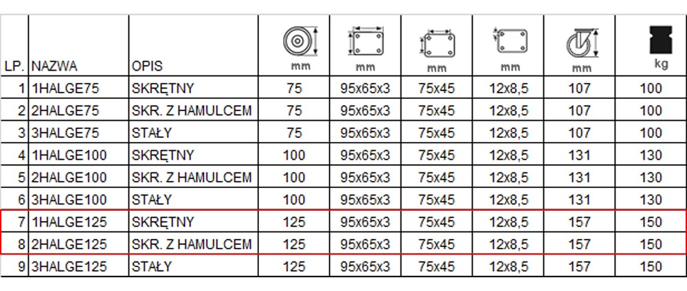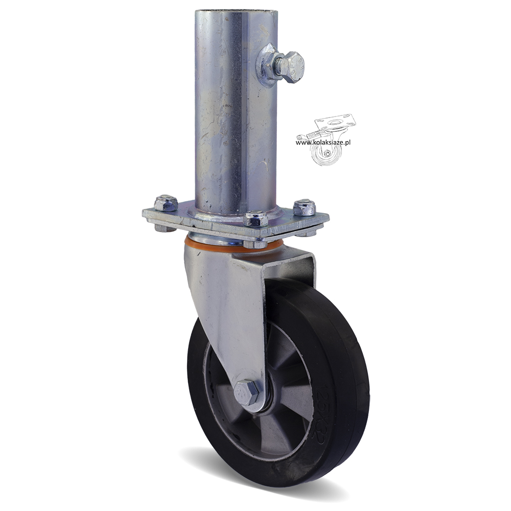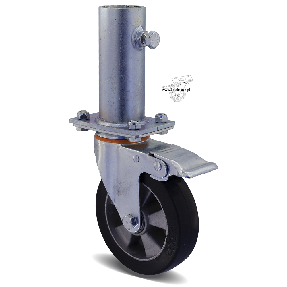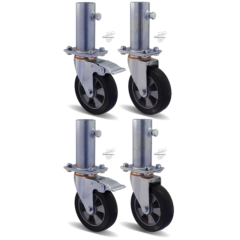 W skład kompletu wchodzą cztery zestawy kołowe, koła gumowe, które wyposażone są w mocowanie na płytkę. W skład kompletu wchodzą dwa koła o kodzie 1HALGE125K2 + nasadka, w tabeli pod pozycją 7 oraz dwa zestawy kołowe skrętne z hamulcem o kodzie 2HALGE125K2+ nasadka w tabeli pod pozycją 8. Koło posiada piastę z aluminium oraz oponę z gumy, obudowa pokryta jest ocynkiem. Wewnętrzna średnica trzpienia to 40 mm, jest dostosowana do najczęściej stosowanych w rusztowaniach warszawskich “stojaków” z rury 33,7 mm. W kole podwójne łożysko kulkowe, waga zestawu 7,04 kg.