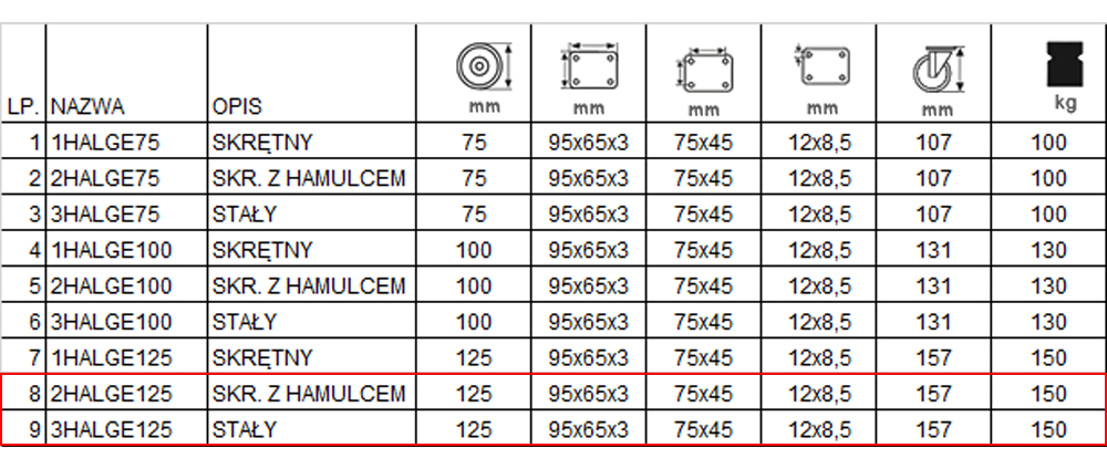 wykonane są blachy stalowej o dużej wytrzymałości, dodatkowo płytka ma wymiary 95x65x3 mm. Poza tym kółka mają średnicę 125 mm, a centra mocowań mają wymiar 95x65x3 mm i owalne otwory do mocowania o wymiarach 12 x 8,5 mm. Na dodatek wysokość całkowita wynosi 157 mm + podstawka 125 mm.