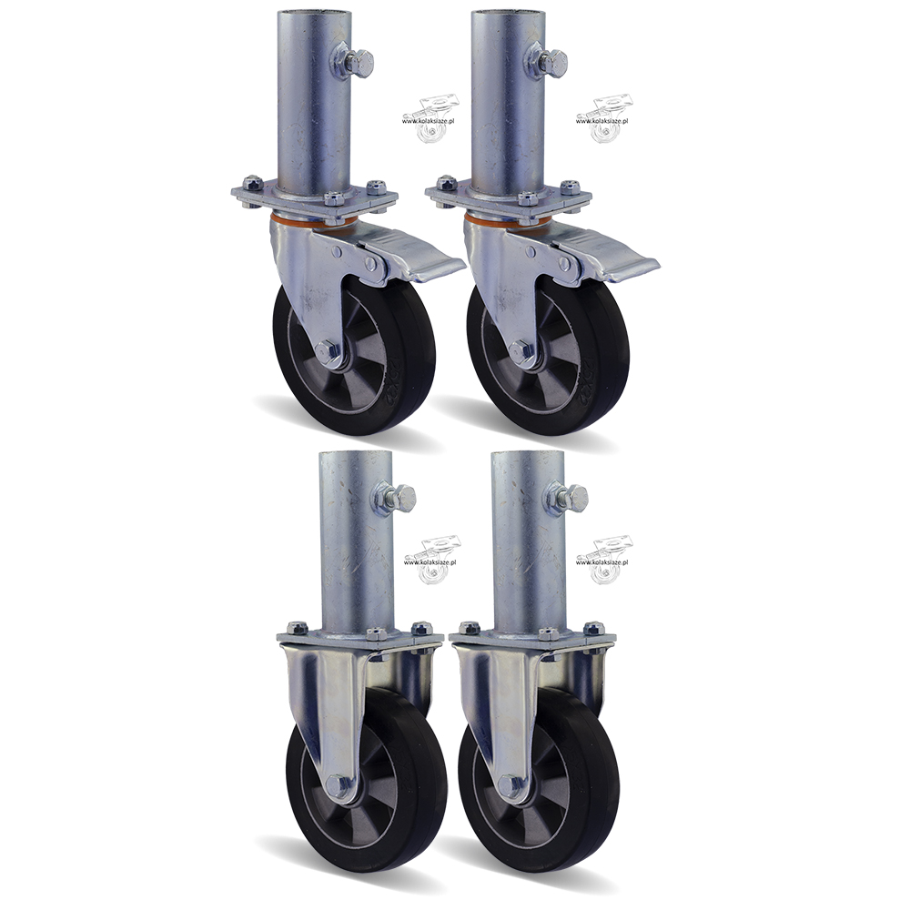 W skład kompletu wchodzą cztery zestawy kołowe, koła gumowe, które wyposażone są w mocowanie na płytkę. W komplecie są dwa zestawy kołowe o kodzie 3HALGE125K2 + podstawka, w tabeli pod pozycją 9 oraz dwa zestawy kołowe skrętne z hamulcem o kodzie 2HALGE125K2+ podstawka w tabeli pod pozycją 8. Koło posiada piastę z aluminium oraz oponę z gumy, obudowa pokryta jest ocynkiem. Wewnętrzna średnica trzpienia to 40 mm, jest dostosowana do najczęściej stosowanych w rusztowaniach warszawskich “stojaków” z rury 33,7 mm. W kole podwójne łożysko kulkowe, waga zestawu 6,67 kg.